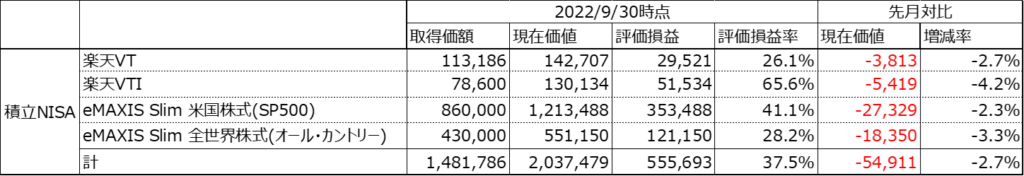 成績としては、9月はマーケット全体が下がっていた点から、先月対比で-3%程度減りました。積立額をプラスしながらのマイナスですので、ほとんど先月伸びた分と相殺な感じです。