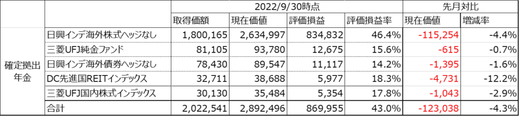 こちらも、9月のマーケット状況を受けて先月から約-4.3%となっています。積立NISAと比べて、下げ幅が大きいですね。これは購入している商品が海外株式中心か、米国株式中心かによる違いでしょうかね。